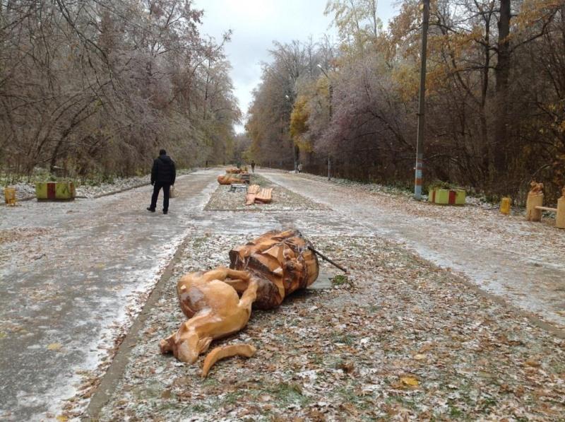 Хулиганы воспользовались тем, что монтаж видеокамер на средства РусГидро был практически завершен, но ледяной дождь повредил линию, которая должна была связывать аллею видеонаблюдением с пультом полиции. Кроме этого, действия вандалов усугубили и без того сложную ситуацию как в г.Новочебоксарске, так и в роще: к поваленным деревьям добавилсь разрушенные скульптуры. Все фигуры были прочно закреплены, для их повреждения требовалась физическая сила нескольких мужчин.