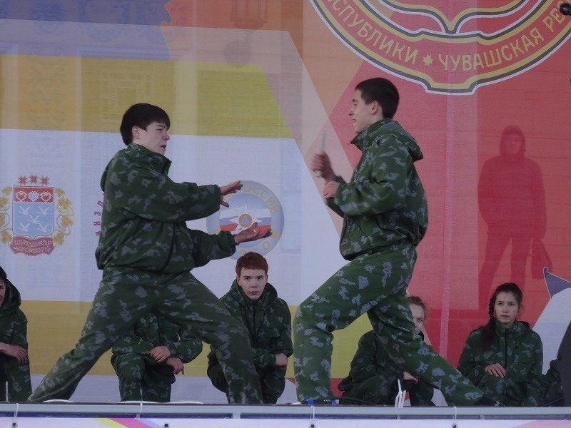 С показательным выступлением выступила школа профессиональной подготовки по правоохранительному профилю "Детская полицейская академия" дворца детского творчества города Чебоксары, ансамбль "Служу Отечеству" Народный ансамбль песни Родничок, Народный коллектив эстрадного танца "Каприз и другие творческие коллективы города.