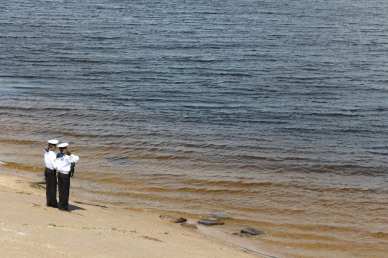 В память о погибших моряках, кадеты "Кадетской школы г. Чебоксары" спустили на воду траурный венок. А воспитанники военно-патриотического клуба "Ушаковцы" отдали воинские почести троекратным залпом из АКМ списанного охолощённого.