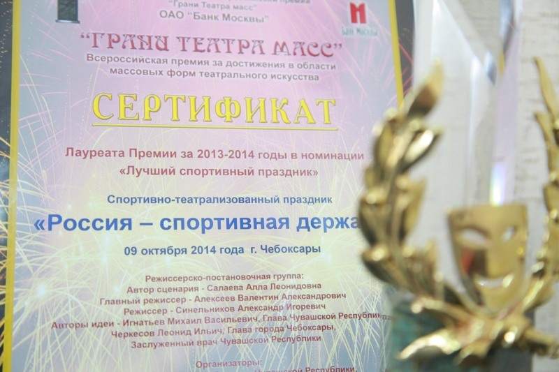Всероссийской премии "Грани театра масс"" за достижение в области массовых форм театрального искусства за 2013-2014 годы в номинации "Лучшее массовое спортивно зрелищное мероприятие" удостоен спортивно-театрализованный праздник "Россия - спортивная держава". Проходил он 9 октября 2014 года на Красной площади города Чебоксары.