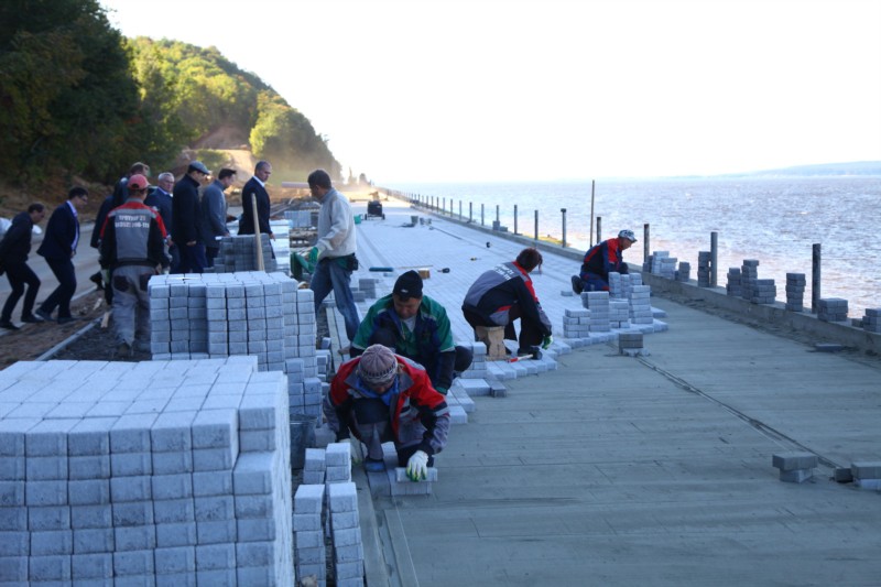 Заместитель директора подрядной организации Виктор Разумов доложил главе администрации, что в настоящее время полным ходом идут работы по установке ограждений, уложен нижний слой асфальтобетонного покрытия протяженностью 800 м и более 40 метров брусчатки.
