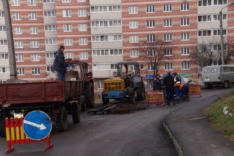 Так, на дворовой площадке по ул. Короленко проводятся работы по поднятию канализационных и коммуникационных люков до уровня асфальта. Специалисты при помощи строительной техники выдолбили часть дорожного покрытия, нарастили стенки колодцев, уложили новые плиты и подняли сами люки до уровня нового асфальта.