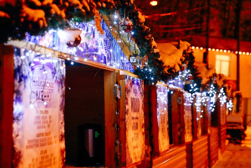 В парке организована рождественская ярмарка. Для каждого домика разработано разнообразное меню, которое включает в себя блины, мясные блюда, сладости и горячие напитки.