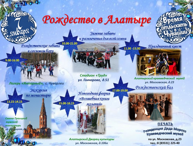 7 января – "Рождество в Алатыре". В этот день экскурсии гостям предложит краеведческий музей. Здесь пройдут выставки старинных рождественских открыток, детских декоративно-прикладных работ "Игрушка на музейную елку", творческих работ "Деревяшкины рассказы", состоится мастер-класс "Рождественская овечка".