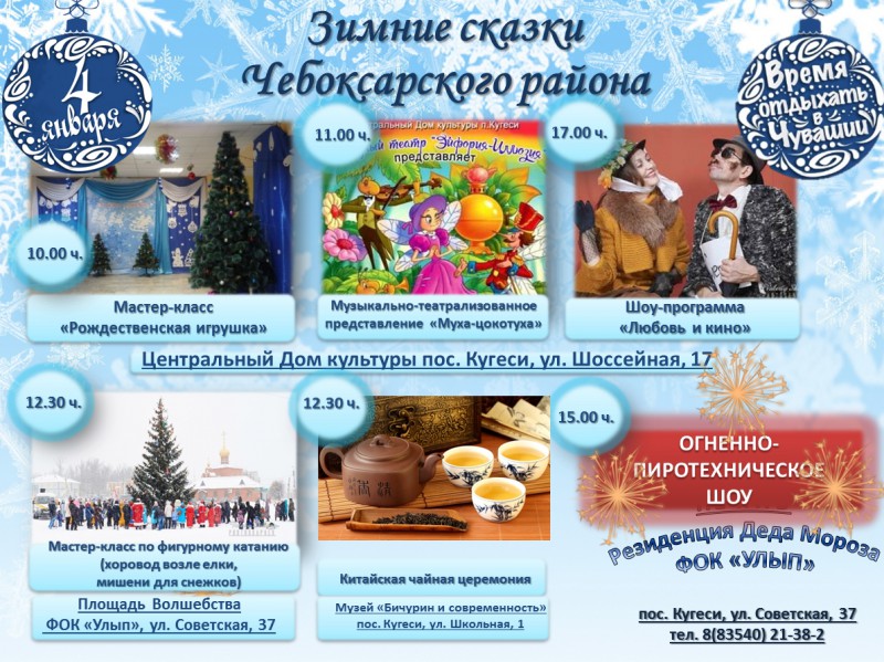4 января праздник продолжится "Зимними сказками Чебоксарского района". В ФОКе "Улып" будет организована выставка-ярмарка декоративно-прикладного искусства. В Центральном Доме культуры состоится мастер-класс по изготовлению рождественских открыток, а затем музыкально-театрализованное представление "Муха-цокотуха". В Чебоксарском районе гости смогут не только провести свой досуг, но и позаботиться о здоровье: покататься на лыжах и коньках, стать зрителями турниров по хоккею, футболу и лыжным гонкам. Праздник завершится музыкальным спектаклем "Старые песни о главном", который пройдёт в Центральном Доме культуры.