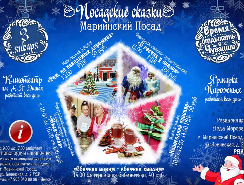 3 января в гости приглашает сказочный Мариинский Посад. Город превратится в сказочную столицу Чувашии. Здесь Вас ждет увлекательное путешествие в старинный купеческий город, где у каждого дома есть своя легенда или небылица. Каждый сможет принять участие в мастер-классе по изготовлению новогоднего сувенира, театрализованном представлении, новогоднем квесте!