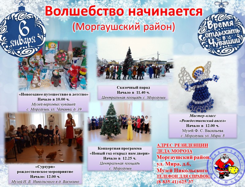 6 января путешествие продолжится в Моргаушском районе по программе "Волшебство начинается". Гости и жители района смогут принять участие в рождественском мероприятии "Сурхури", Сказочном параде, концертной программе "Новый год открыл нам двери". Моргаушцы с нетерпением ждут гостей и уже готовят праздничные мероприятия!