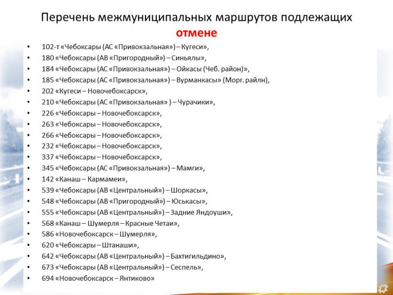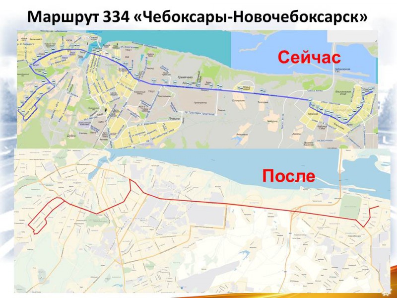 «Исключение сделано для сообщения «Чебоксары – Новочебоксарск». Проведены дополнительные выезды, обследование, мониторинг транспортных потоков. Совместная проведенная работа Минтранса Чувашии с администрацией города Чебоксары по межмуниципальным перевозкам позволила прийти к следующему варианту. После принятия Документа планирования в сообщении «Чебоксары – Новочебоксарск» будут отменены маршруты: 226, 232, 263, 266, 337. Изменится схема движения транспортных средств 334 маршрута по г. Чебоксары», – сообщил он.