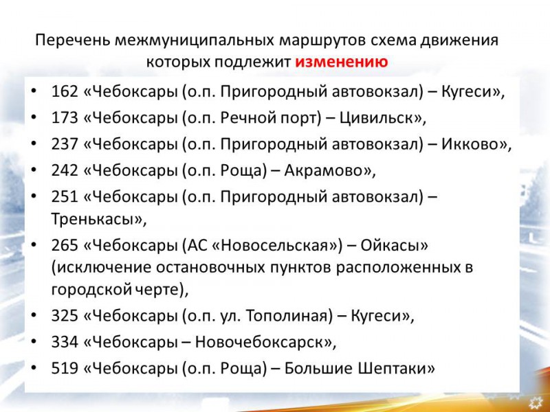 Согласно Документу планирования начальными и конечными пунктами отправления межмуниципальных маршрутов регулярных перевозок в г. Чебоксары определены автостанции «Новосельская» и «Привокзальная», Пригородный и Центральный автовокзалы. Документ планирования изменяет и отменяет межмуниципальные маршруты. Планируется отменить 22 маршрута и изменить схемы движения 9 межмуниципальных маршрутов.