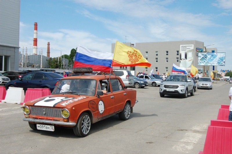 Участники автопробега праздничной колонной, украшенной флагами Российской Федерации, Чувашской Республики и города Чебоксары, проехали по главным улицам столицы.