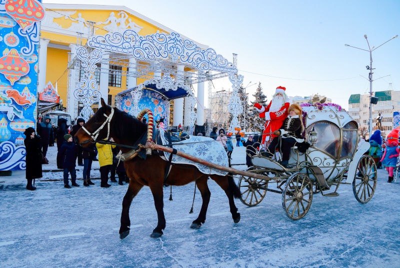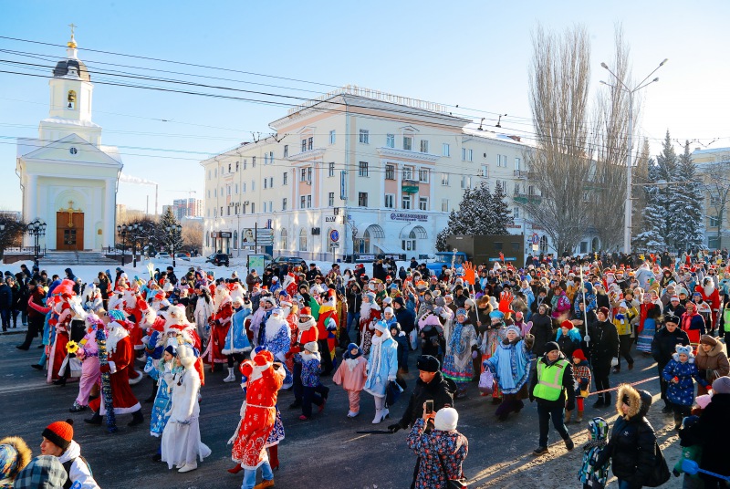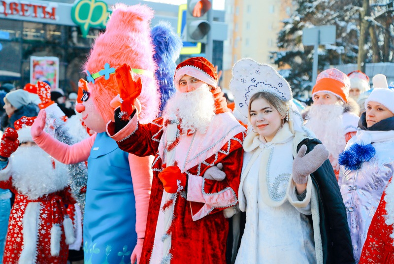 Под звуки муниципального оркестра жители прошли по проспекту Ленина и ул. К. Маркса. Главный Дед Мороз города со Снегурочкой поздравляли жителей и гостей столицы с Новым годом из сказочной кареты.