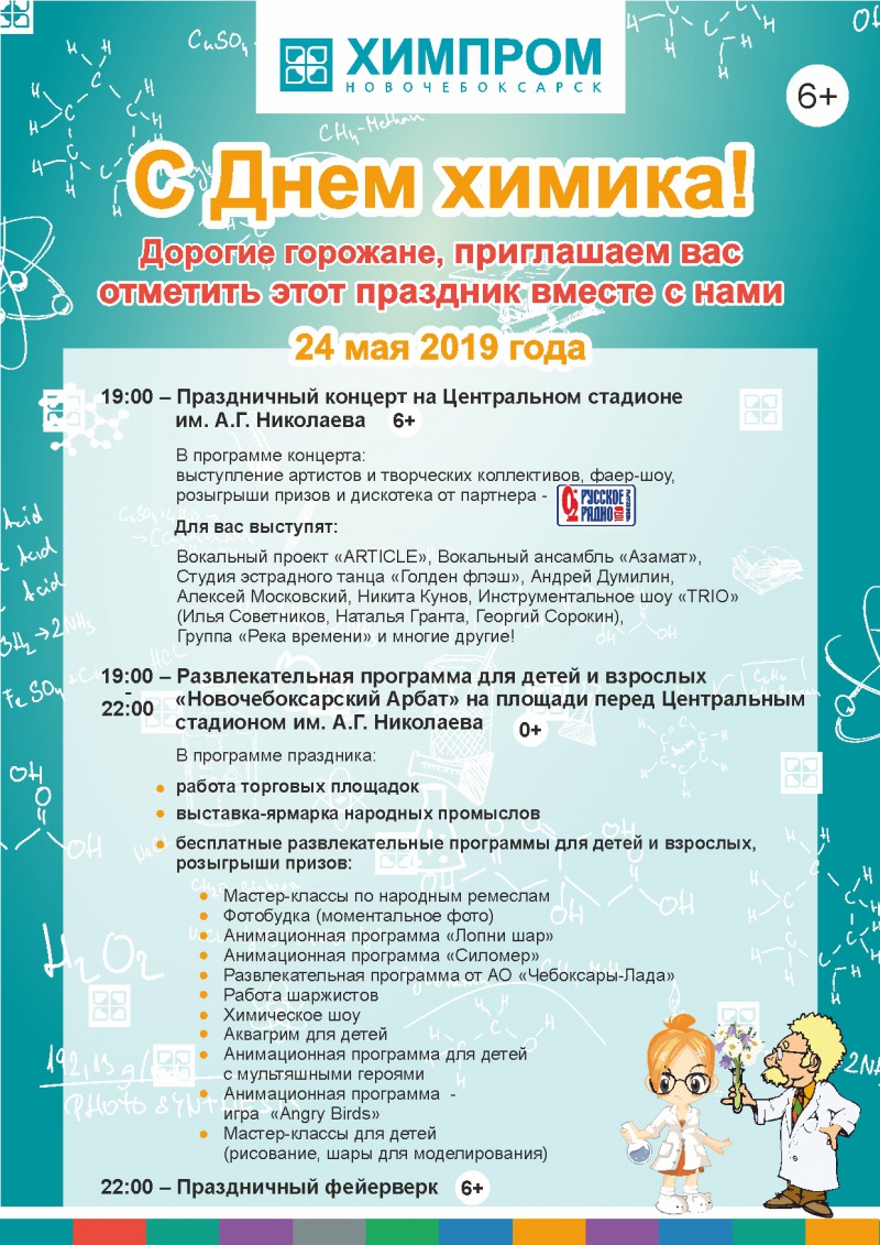 Программа празднования Дня химика в г. Новочебоксарск 24 мая 2019 года.