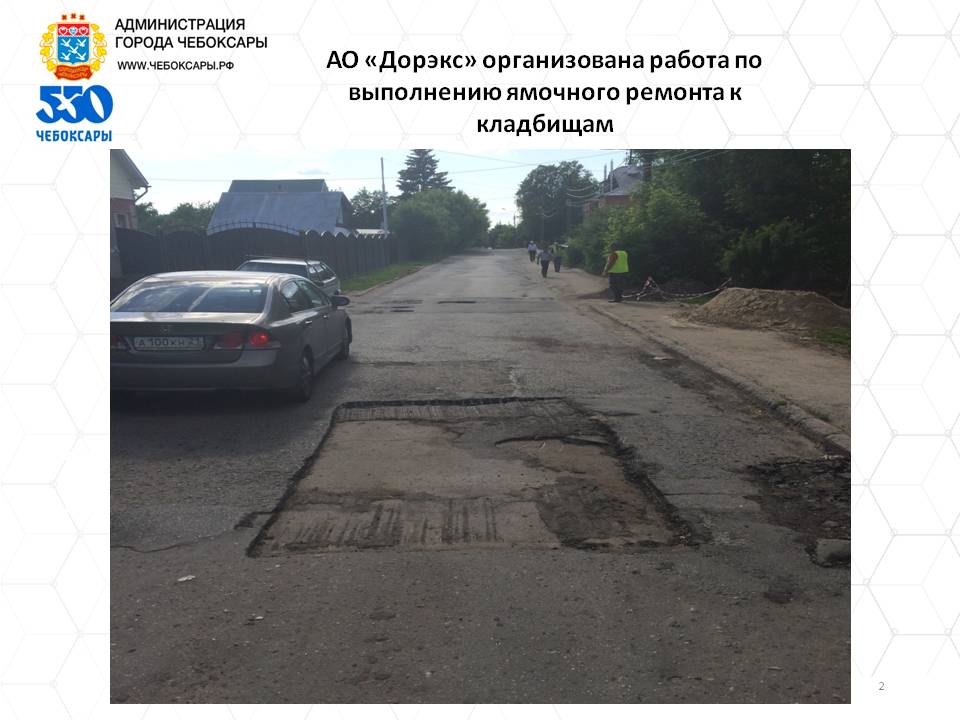 Благоустройство. К настоящему времени силами АО "Дорэкс" выполнен ямочный ремонт проезжей части улицы Заовражная, в течение недели будет отремонтирована проезжая часть дороги от трассы М-7 до АО "ЧПО им. В.И. Чапаева" и участок дороги от ул. Кирова до кладбища №11,12,17,18.