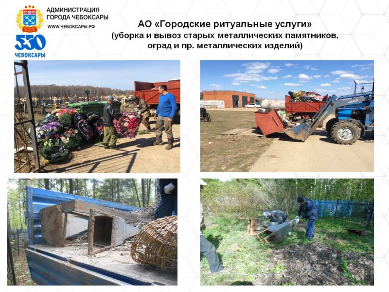 АО "Городские ритуальные услуги" продолжает уборку мусора, старой травы, листвы и веток, санитарную рубку аварийных деревьев, подметание и уборку пешеходных дорожек и тропинок, покос травы и уборку на городских кладбищах. Ведется ремонт и покраска контейнеров, урн, скамеек, емкостей для воды, информационных стендов. На кладбище №4 завершены ремонт и покраска забора и ворот.